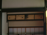 | 茶室、好刻庵へ。市松模様のふすまや、部屋の中のあちこちに三玲氏のこだわりが感じられます。 |
