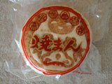 「越山甘清堂」の焼きまん、今回は小さいサイズのものを買いました。やっぱり加賀八幡起上りのデザインを。他に金沢城やことじ灯篭などの絵柄もあります。