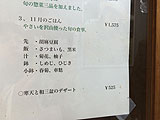 11月のご飯は、先・胡麻豆腐、飯・さつまいもと黒米、汁・菊花と柚子、鉢・しめじとひじき、小鉢・春菊と車麩。