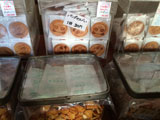 ガラスケースに昔ながらの煎餅やクッキーが並んでおり、量り売りで袋に詰めてもらえます。店舗の裏が工場になっており、ご主人が焼いています。
