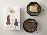 いわさきちひろさんのパッケージは”木の葉の精”と”りんごの天使”、そして”松本 かきもち 白樺しお味”を通常サイズと小袋入りも合わせて。