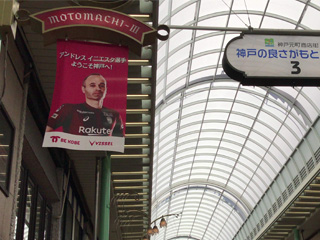元町商店街にはイニエスタのフラッグ。”ようこそ神戸へ!”と書かれています。