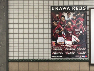 千代田線から南北線に乗り換え、浦和美園駅に着いたのは11時半を少し過ぎた頃。壁に貼られているポスター、駅のホームの柱、ところどころレッズ色が(でも対戦相手はレッズでは無い)。