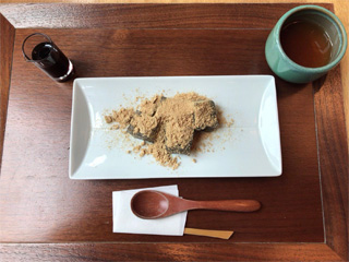 一時間ほど並び、ようやく”すずのパフェ”を。水羊羹、豆、フルーツ、選べるアイスはバニラと黒胡麻を。夫は蕨餅、どちらも分けました。ほうじ茶付きです。