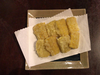 夏に来たらやっぱり食べたいとうもろこしの天ぷら、山賊焼きはハーフサイズ(それでも多い!)、ご飯と汁セットを頼み、おいしい料理とともにいただきました。夫は〆に焼きおにぎりの青唐辛子を。