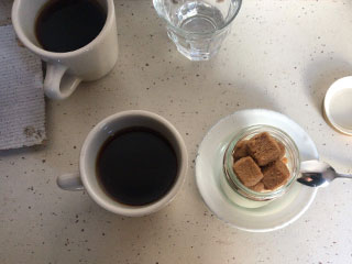 私はホットのカフェオレ、夫はブレンドコーヒー、そしてやっぱり何か食べたくてバタートーストをいただきました。