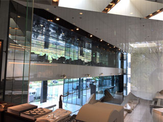 座りやすい椅子だったり、窓から見える高橋是清翁記念公園の緑、丹下健三のミラーガラスに映る緑。黒い大理石のテーブルにも緑が映っていたり素晴らしい空間。