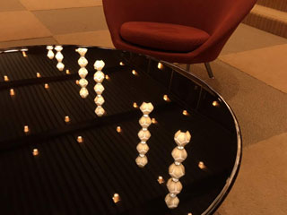 旧本館のロビーが復元されており、特徴的なデザインのランタンがLED化されていたり、梅の花のようなテーブルと椅子も健在。