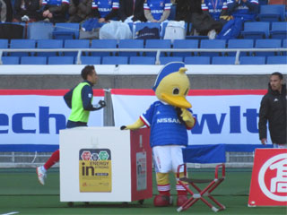 新横浜駅に着き、荷物をホテルのフロントに預けます。ホテルに併設されている商業施設にはマリノスのフラッグとともに寄せ書きが。そしてマリノスケも!