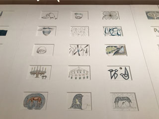 鉛筆や絵の具、貼り絵などの方法で作られたデザイン画が飾られています。